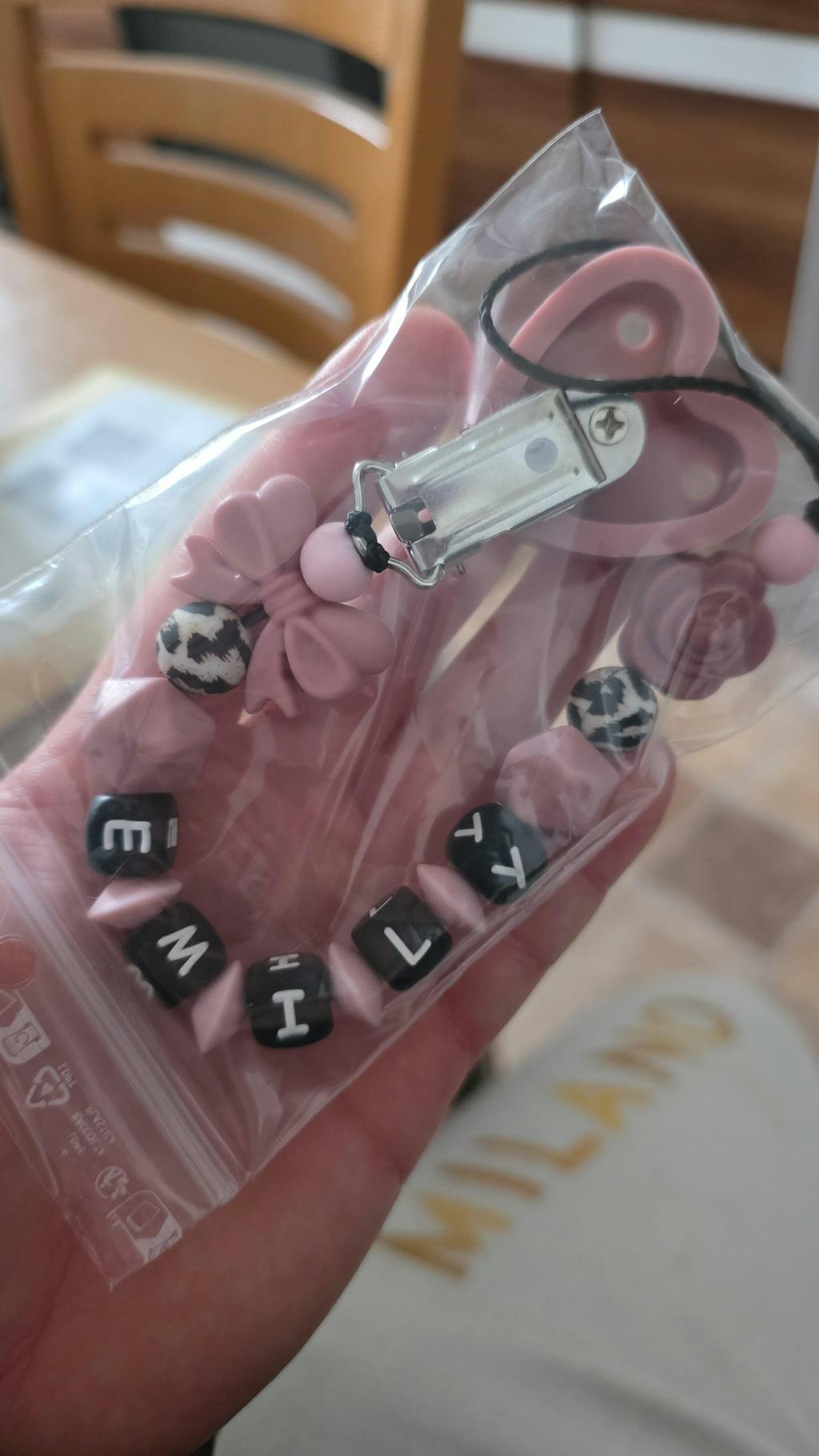 Zufriedene Kunden die eine Schnullerkette mit Namen bestellt haben