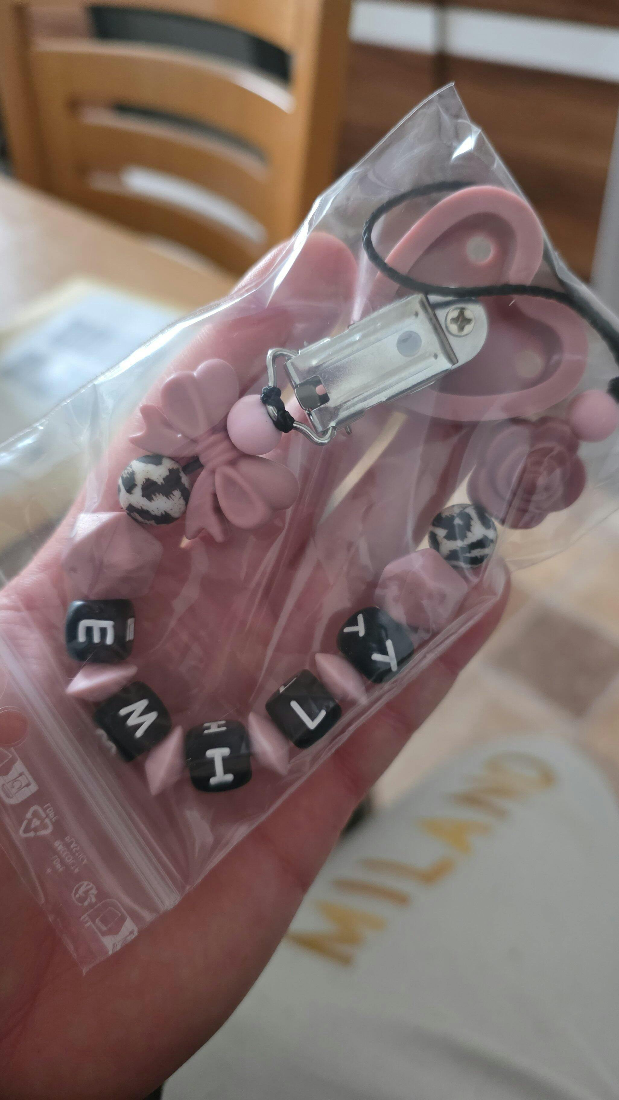 Der Name am Beißring kann bis zu 10 Buchstaben haben, je nach Länge des Namens werden Perlen entfernt oder durch kleinere ersetzt.