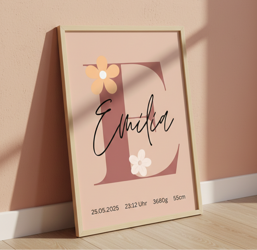 Bringe sanfte Erdtöne und florale Eleganz in dein Kinderzimmer! Dieses liebevoll gestaltete 3er-Set kombiniert ein Bild mit Namen und Geburtsdaten mit zarten Blumenmotiven. In warmen Beige- und Apricot-Nuancen gehalten, strahlt diese Wanddekoration Ruhe und Geborgenheit aus.