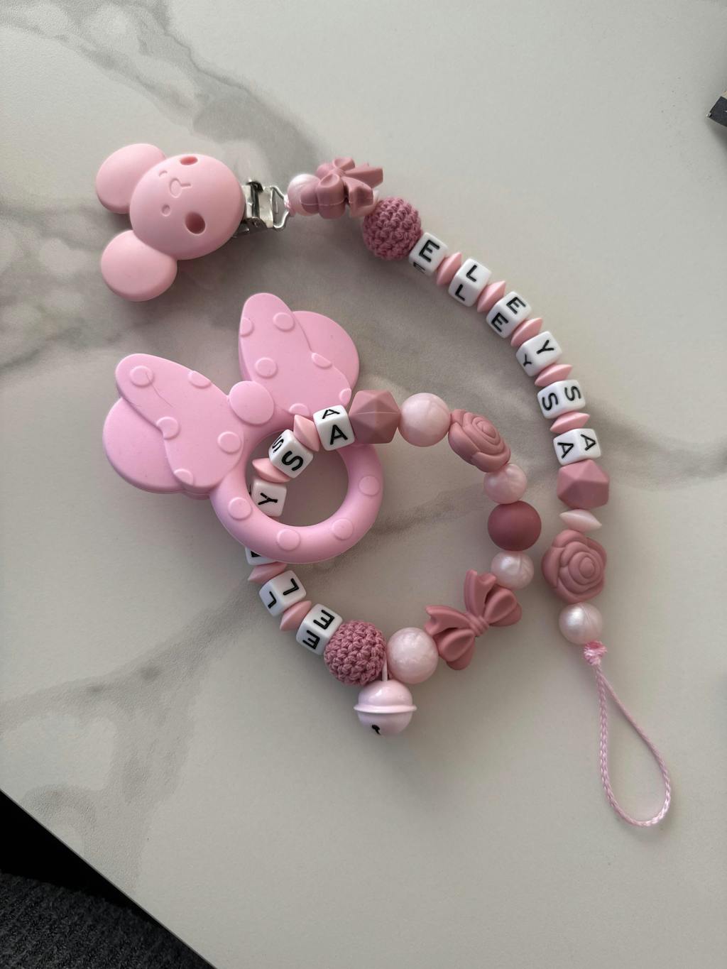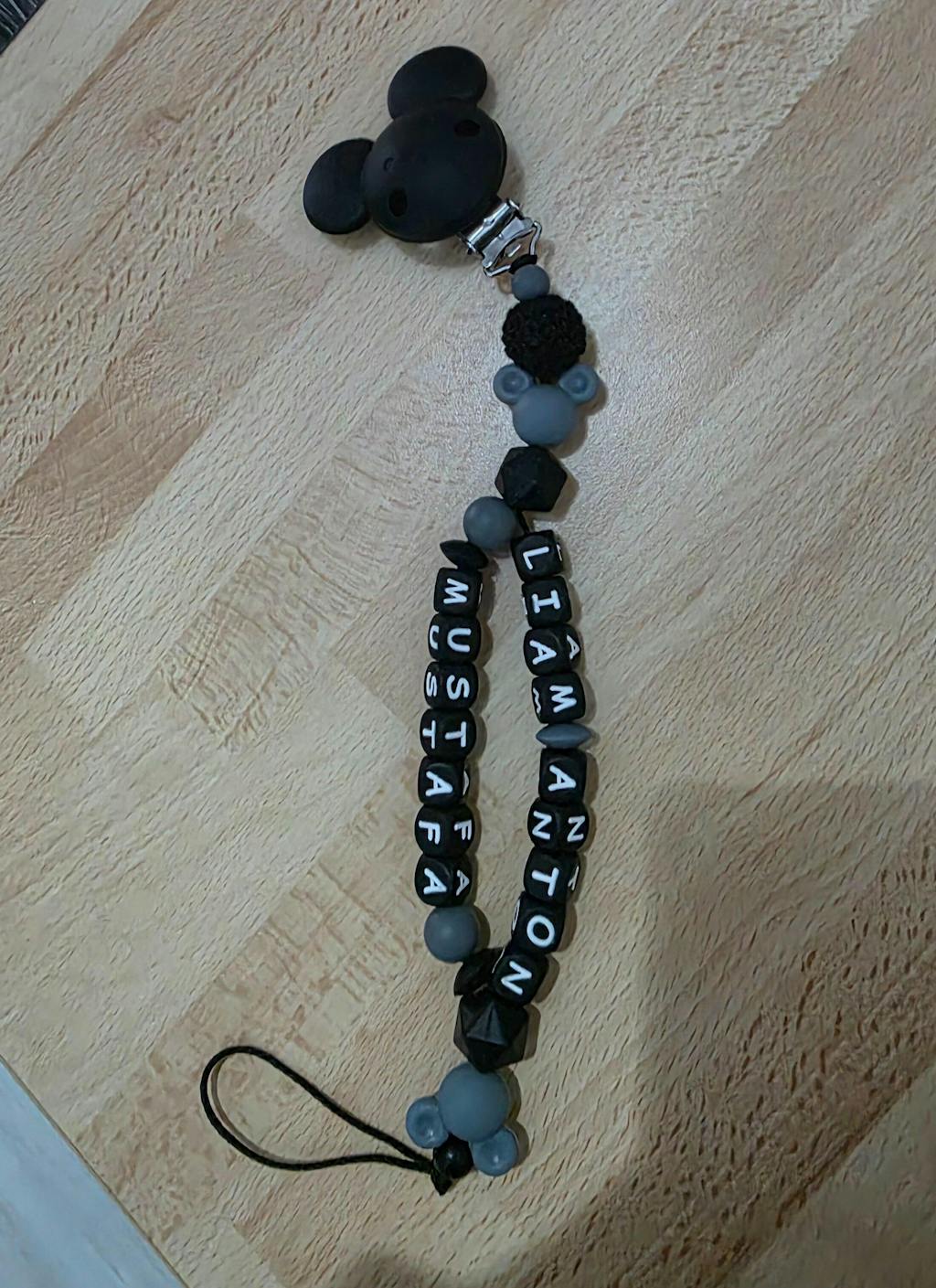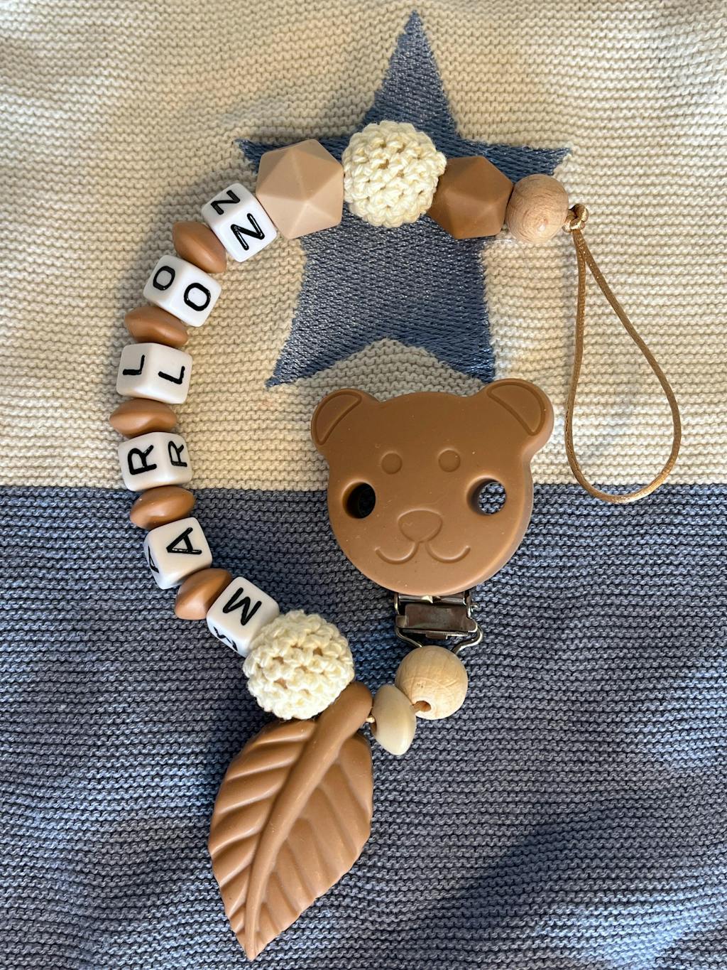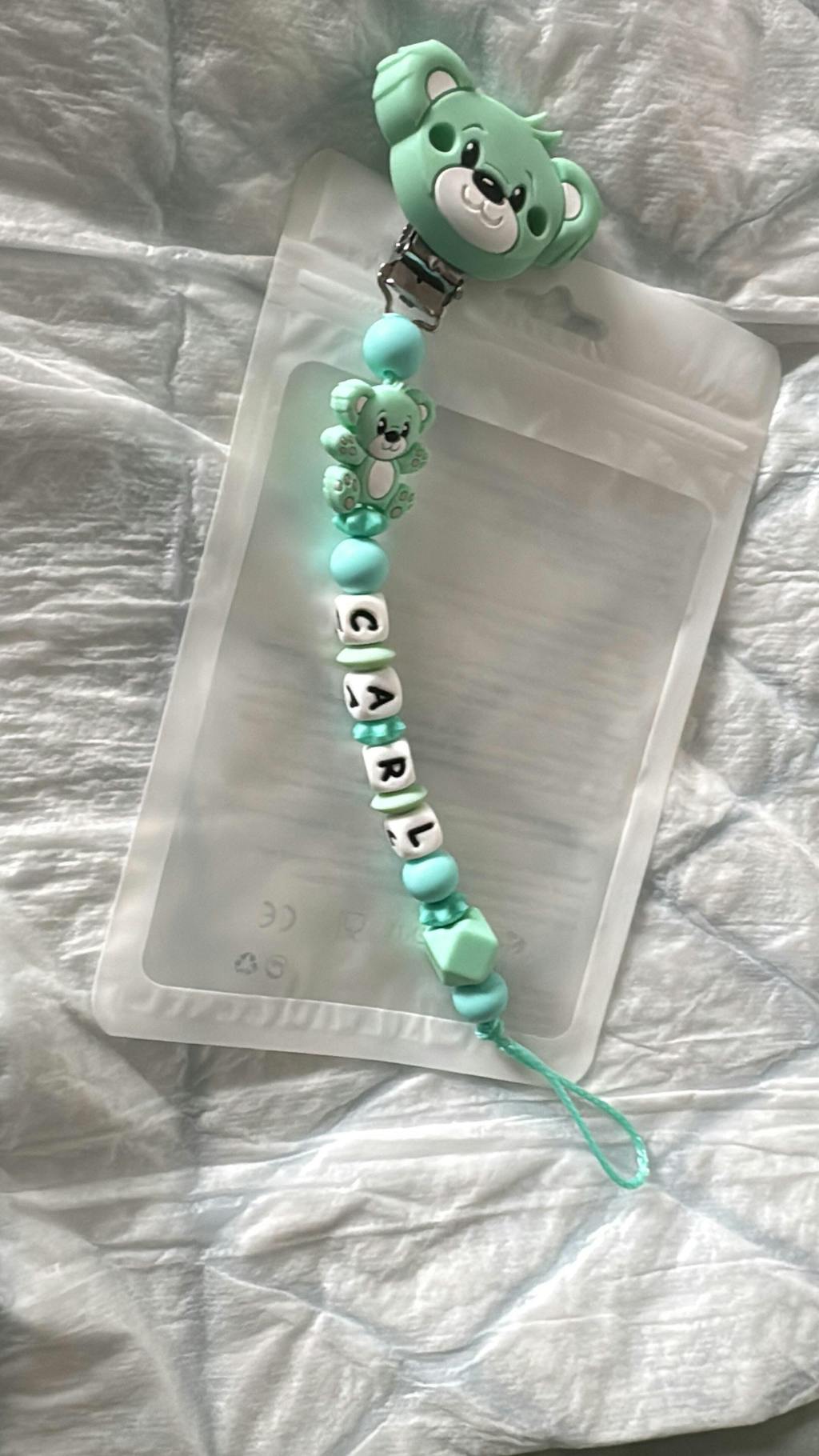 Ich finde die schnullerkette sehr schön, jedoch hätte ich mir gewünscht, dass sie etwas länger ist, da der Name meines Kindes nur zwei Buchstaben hat. Es wäre cool gewesen wenigstens zwei Perlen mehr aufzufädeln..