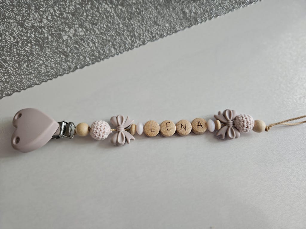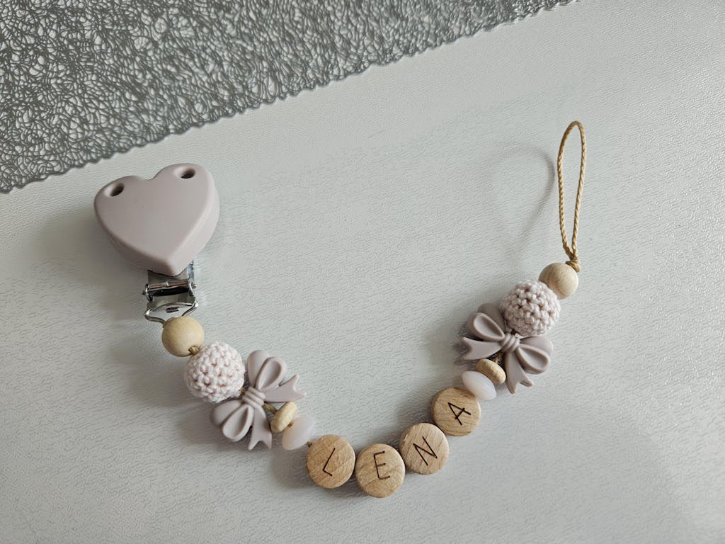 Süße Schnullerkette mit Namen aus Silikonperlen und Natur-Holzperlen